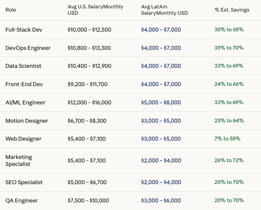 Nearshoring to Latin America can lead to substantial cost reductions. Companies report at least up to 70% savings in labor costs when hiring tech talent from the region, making it a financially attractive option for U.S. businesses.